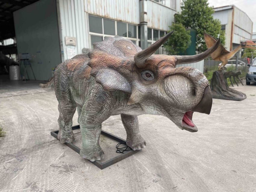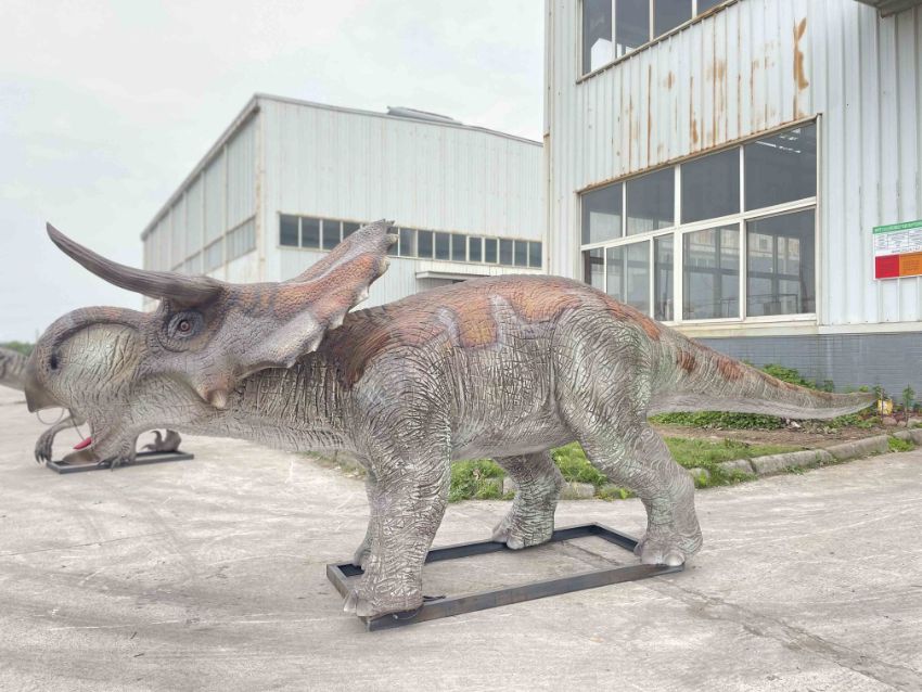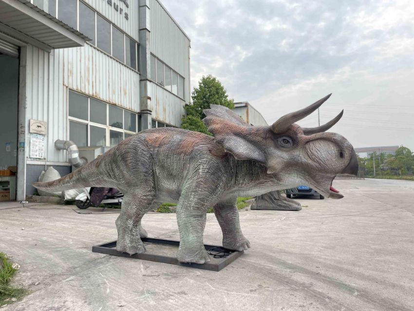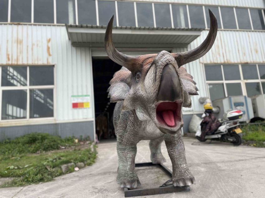 Animatronic Nasutoceratops by Only Dinosaurs, 4.6m long, 1.1m wide, 1.7m high, approx. 200kg constructed from quality steel structure, high-density sponge and three-layer silicone, comes with control box with control box which operates sound and movement including mouth opening and closing, head left to right, neck up and down, stomach breathing and tail swinging. Accessories include one infrared sensor, one remote control, one speaker with volume control and built in amplifier and woofer (please note this lot is part of combination lot 38)